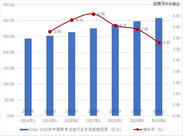 目前,粉末冶金技術(shù)已經(jīng)被廣泛應(yīng)用于交通、機(jī)械、電子、航空航天、兵器、生物、5G通訊和新能源等領(lǐng)域。隨著這些領(lǐng)域?qū)Ψ勰┮苯甬a(chǎn)品的需求逐漸增大,金屬粉末的需求預(yù)計(jì)將會(huì)在未來(lái)十年快速增長(zhǎng),預(yù)計(jì)2024-2030年中國(guó)粉末冶金行業(yè)市場(chǎng)規(guī)模平穩(wěn)上升,到2030年中國(guó)粉末冶金行業(yè)市場(chǎng)規(guī)模將達(dá)到307.81億元。